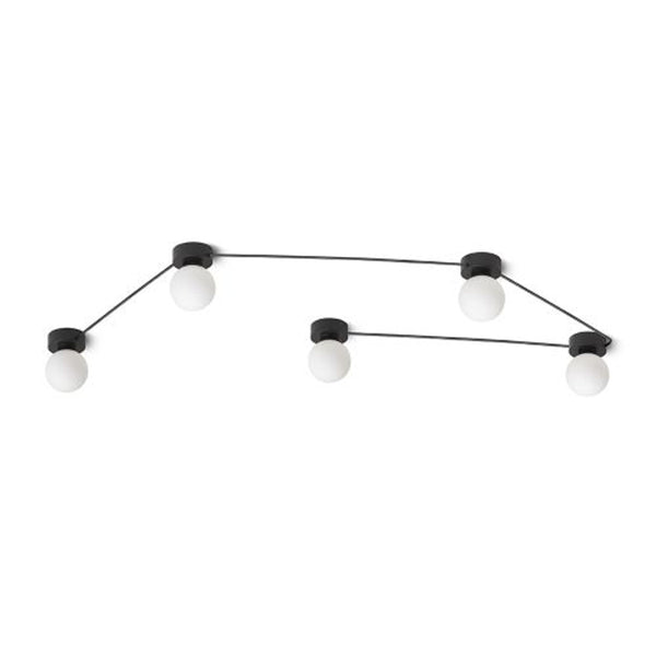 Ceiling or wall lights with glass shades on black lacquered bases, connected in a row by black cables. The fixtures can be arranged in groupings according to your imagination. Suitable for LED light sources with a G9 base.