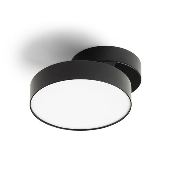 Cylindrical, directional ceiling light with GU10 socket for LED light sources, including a decorative shade of brushed black brass. Different color-combinations are available by purchasing additional shades in other colours.