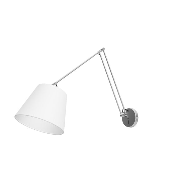 Wall lamp with adjustable arm, a textile shade and a switch located on the base.