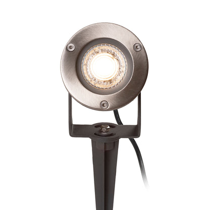 Outdoor spotlight of aluminium on spike, with a GU10 socket and a stainless front plate. Including a 1m lead cable without plug.