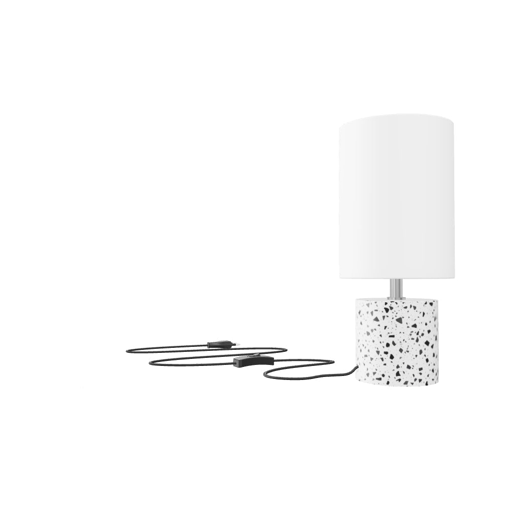 Minimalistic table lamp with a cylindrical shape and a textile shade. Each base has its unique pattern.