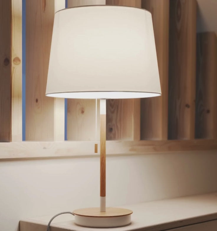 A table lamp with a fabric shade and a USB port built into the base. The base is in imitation beech with white lacquered details. Suitable for LED E27 light sources.