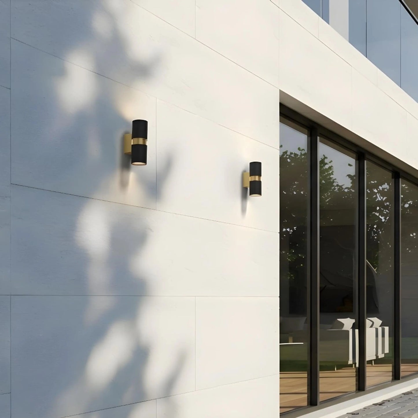 Outdoor wall light in a combination of brass and black lacquered metal for two GU10 LED light sources.