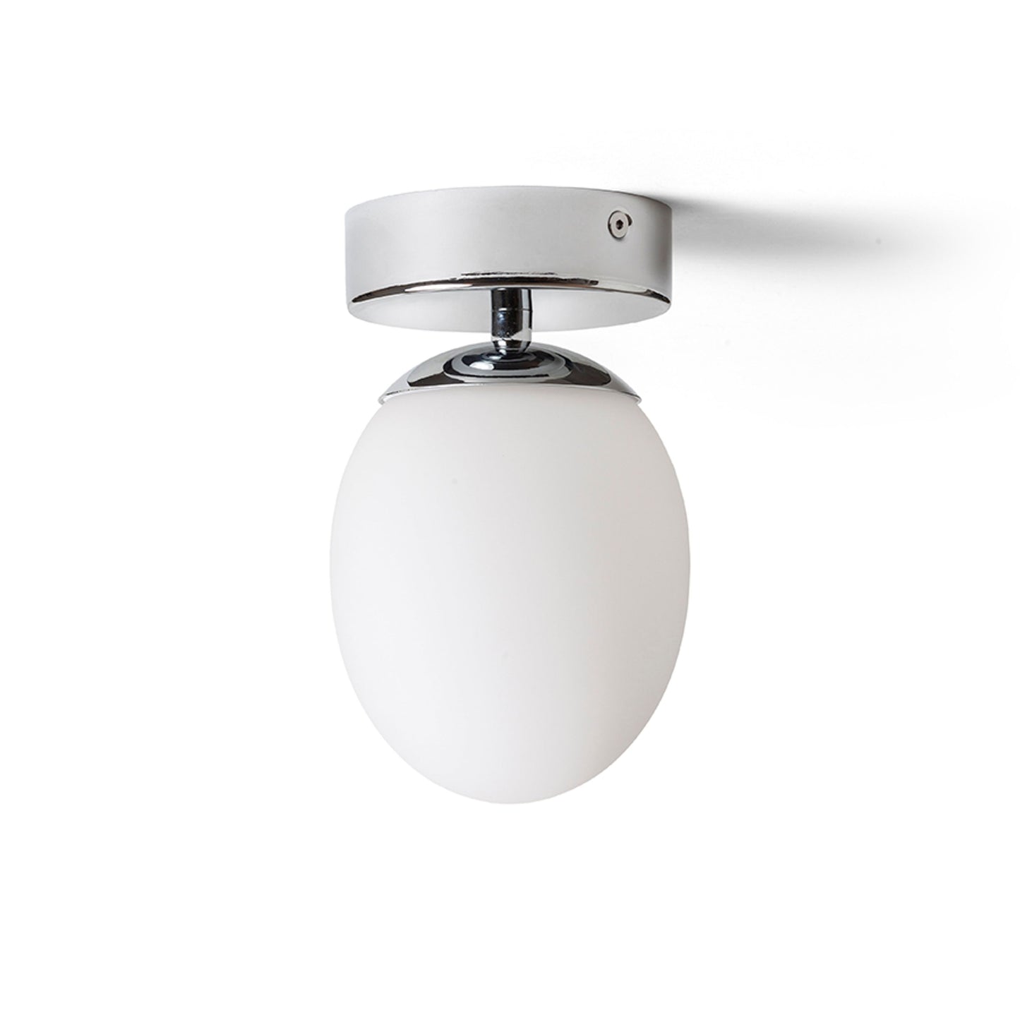Oval-shaped ceiling lamp of glass on a chrome-plated base. Suitable for use in bathrooms.