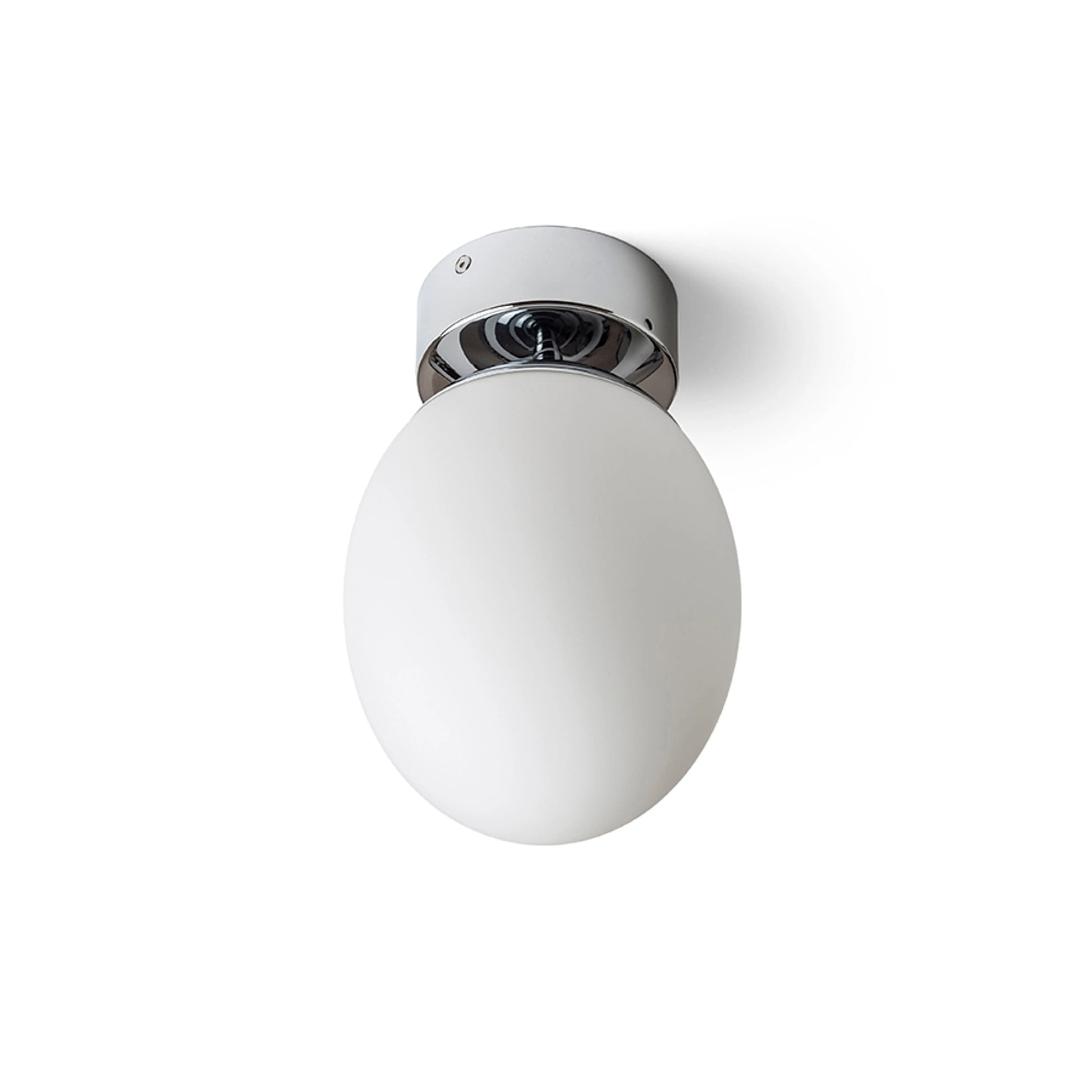 Oval-shaped ceiling lamp of glass on a chrome-plated base. Suitable for use in bathrooms.