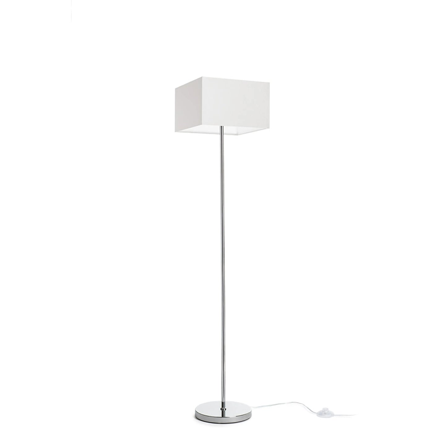 A floor lamp with a chrome base and a fabric shade. Suitable for LED E27 light sources.