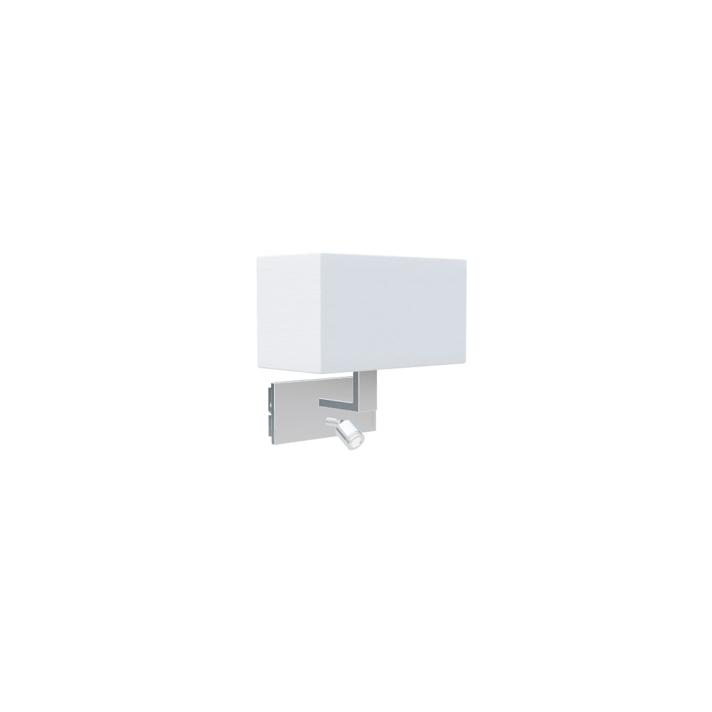 Wall lamp with a textured textile shade and a 3W LED reading light, both of which can be controlled individually by separate switches at the bottom of the base.