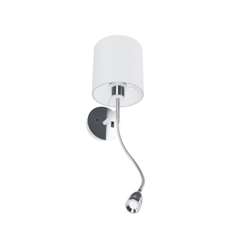 Wall lamp with a textile shade and LED spotlight on gooseneck. Both light sources can be controlled individually by switches located on the round base of the lamp.
